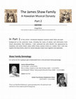 The James Shaw Family A Hawaiian Musical Dynasty Part 1 The first chapter of the incredible story of James Shaw and his musical family in Hawaii and America explores his famous colleagues and their appearances at early World Fairs. |