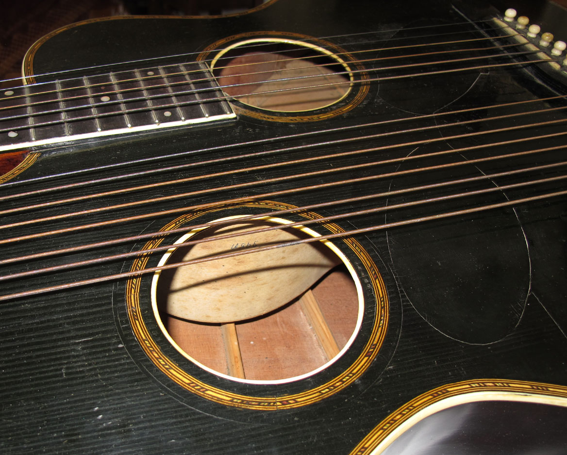 The most noteworthy feature though was the internal second body, which the Forum users finally figured out, but which the seller totally glossed over.  This is a big deal, the crux of the well-known 1912 patent.  Curiously, among the 5 known surviving Maurer/Stahl harp guitars of the double-hole “Picasso” shape (see also “Dumb & Dumber”), none but the hollow-arm specimen have the internal body (which would seem to be the only point of an instrument with otherwise questionable aesthetics)!  This, then (the 6th surviving), would be only the second specimen found with the key feature (if anyone knows differently, please let us know!).  Yes, I briefly owned the other (Bob Hartman>Stacy Hobbs>me>Stacy…long story), and hope to again perhaps – so another reason not to miss this chance.