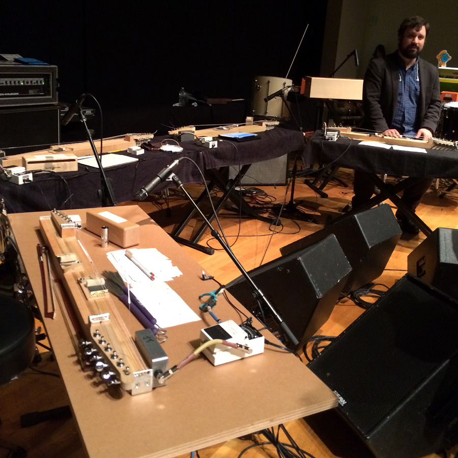 Friday night’s museum concert was an unusual performance by So Percussion. I can appreciate the Steve Reich and John Cage stuff up to a point, but frankly am more of a “Stomp” and Blue Man Group guy. I liked the last piece “Music for Wood and Strings” by Bryce Dessner, as it utilized these custom-built percussively-played dulcimer-like string instruments, amplified and with four banks each. The bass version with frets was pretty cool.