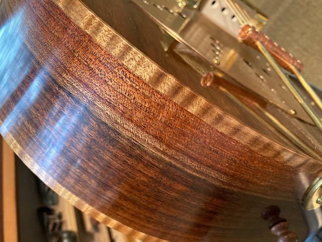 I then followed that up with a blog that included much more detail on the construction of the instrument. Both addressed Orville’s “mystery wood” that has the unassailable appearance of walnut in one area but the irrefutable look of mahogany in another – with no seam in-between! Here’s what I last wrote about it in March 2018 (with no one taking the bait):