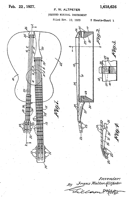 only instrument of his that anyone has ever seen! DOUBLE BASS UKES I'm assuming the patent date reflects the patent for a somewhat different instrument which Altpeter was granted on Feb. 22, 1927 (thanks to Michael Holmes of Mugwumps Online for leading me to it). This equally strange instrument is shown below. |