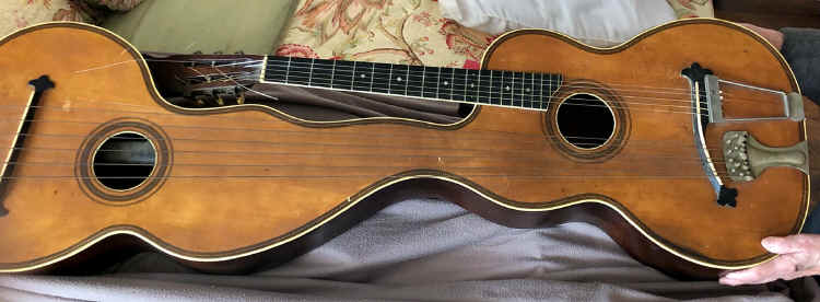 another specimen she once ran across: "When I was in Chicago a number of years ago I dropped into a music store that was in a high rise building there. When I showed the owner a picture of the “goitar” he said he had one in the back storeroom that was in pieces. Mine was originally owned by a man named Campbell who worked for the “Great Northern Railroad” promoting trips to the West." 11/1/19: Dave Usher says that his mother acquired the Gardie/Harmony harp guitar about 1970. It's thus entirely likely that the one she heard about in the Chicago high rise building music store was the same one that Michael Schreiner saw (rebuilt, in the Wurlitzer window) in 1982. Alex later replied to my blog (above) telling me: "Many years ago (in the 1960’s perhaps) I got a telephone call from a lady at our church who knew I was a folk singer. She said that she and her husband were leaving town to retire in Wisconsin and she had a guitar that had been given to her by a Chicago man named Campbell who had worked earlier in the century for the railroads encouraging people to tour the great Northwest by rail. He would give programs singing with the guitar. He used it to sing to groups of children in summer camps in Michigan too. She started to describe the guitar on the telephone and I thought maybe she had downed one drink too many. She said she would like me to have it if I was interested. I went over and took a look and, gee whiz, it was just as she described. It was in its custom case which has just as many outrageous curves as the guitar itself. Of course I took it off her hands. I told her I couldn’t afford to pay her what it was worth …. that I could only pay $300 for it, which, thank heavens, she accepted. Soon after we had an unveiling at a folksingers’ party at our house and various people offered monikers for her; The Goitar, the Push-me-pull you, and the Two-Seater. When Darcy Kuronen borrowed her for the Boston Museum show he was kind enough to have bass strings custom-made, and Steve Howe of Yes had a good time trying it out. There was also a track of someone playing it on the exhibit recording." 11/1/19:
