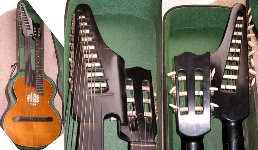 (Bruno & Sons) This company offered unique harp guitars with doubled courses on the neck - most commonly standard "12-string guitar" configuration, but also with 10 strings-on-the-neck (just 4 lower courses doubled). -GM |