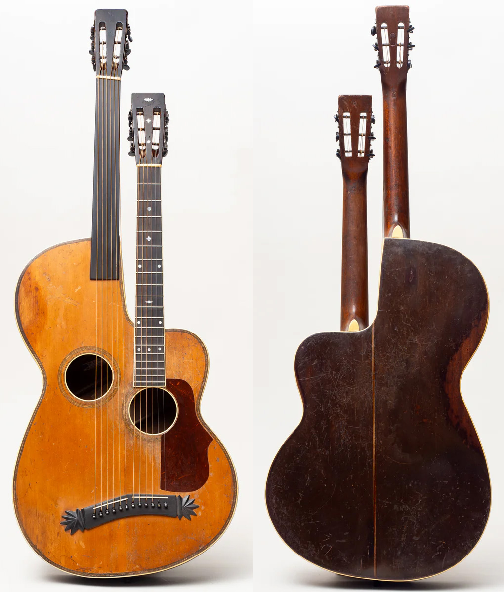 | Larson Brothers Maurer and Stahl 1912 Patent Harp Guitars by Gregg Miner Updated October 2025 This page includes all the specimens and images I have found of the distinctive "Picasso" harp guitars. It is now clear that there were two distinct body shapes and two different brands (Maurer and Stahl). Type 1 is similar to the patent drawing (with the necks parallel or diverged) and is seen in double-neck versions and hollow bass neck versions within the two brands. Type 2 is similar, but does away with the larger bass body protrusion. Some have the Maurer label (or are "attributed to" them) and at two have a Stahl label or stamp. Curiously, extremely few of these actually have the internal "parlor guitar" inside! I know - why build such a thing without the patent inner body?! My recent (2025) conclusion is that the internal body specimens were made specifically for William Stahl, and the non-internal body instruments were labeled "Maurer." In other words, the Larsons made both Type 1 & 2 shapes for themselves under their Maurer brand, but were prevented from including the internal body by an agreement or contract with Stahl who wanted an exclusive. I realized this while writing my article Walter A. Boehm, the Gibson Harp Guitar and Their Influence on America's BMG Community.