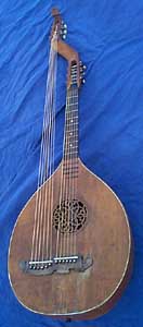 The slightly later French 10-string instrument by Caron is more of a mystery. Note how the gut strings of his invention attach to the tail block. Two similar specimens are known, with the right one (Paris) showing a fascinating string sharping system for the 4 sub-basses. The tuning is not known. Again, if the name is accurate, one is tempted to theorize standard guitar tuning for the 6 neck strings (which was not unknown, but still rare, in 1785). Godwin postulates a tuning which would appear in a similar, but much later, 1848 instrument, with the known tuning of G A Bb C / d f a c' e' g'. This is certainly likely, as it resembles that of the French arch-cittern of the same general time frame. Regardless of tuning, the form alone seems to make it more of a hybrid invention, like the bissex. |