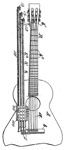 I apologize for being so derogatory in choosing a "popular name" for this invention, but that's what it reminds me of. A plank of wood, held off the back of the guitar and secured (unlikely) by a tailpiece connection and headstock brace. The 7 (shown) sub-bass strings are then strung over the guitar to mount only to this attachment, tuned via zither or piano pins. One advantage I see is that one could have almost unlimited length for the sub-bass strings! I haven't translated this yet - I may be missing something! No examples known of yet another strange (and fairly recent) French invention. |
