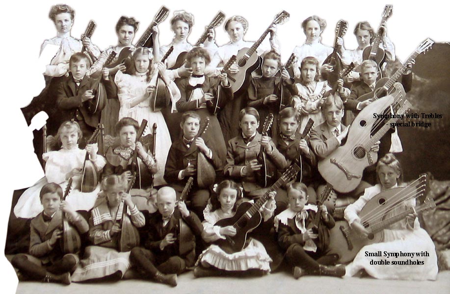 | Introduction Readers since 2003 will remember the discovery of perhaps the most exciting Knutsen historical photograph ever - the incredible image from the August, 1902 issue of The Cadenza magazine. The original image was less than 3" x 5", and we were able to make out a lot of details, though not nearly as many as we would wish. Cut to early 2008, when an even more incredible discovery was made – not just a significantly better image of the Payne photo, but very possibly the original itself! And what an original! Not a standard cabinet card, but a peculiar composite image measuring some 23" x 14” (not including its original frame). The owner of this prize, Dirk Vandeberg of Guitar Safari in San Pedro, CA had told me that the photo was unusual over the phone, and sure enough - there appeared to be an outline around the heads and instruments, indicating the photograph was in fact four separate images joined together. The photographer had re-used the same small stage and riser to shoot the class in four separate sittings, not one large one. The results were then cut and pasted together. As the very crisp image appeared perfectly flat through the glass, we could not guess at the process used to make this image. Since it was virtually impossible to get a decent photograph through the 100-year-old glass, I convinced Dirk to open the backing and remove the photo. Running our fingers over the joined areas, we were stunned to feel the raised edges of the original four cut and glued-together photographs! This was either the original used to create the Cadenza photo submission, or one of several originals (assuming some dedicated member of the group had volunteered to create more than one of these special images). Bottom line: We now had the best possible master with which to re-do our study of the group members and instruments. Not surprisingly, there were some new findings. The first task was in identifying and re-counting the 13 Knutsen harp guitars in the composite photo. Since four separate shots were taken, we now realized that the instruments could have been re-used up to four times. Even though the Cadenza caption mentioned 75 simultaneous performers, many of these instruments appear suspiciously similar. After exhaustive analysis by myself and assistant Knutsenologist Darrell Urbien, the results showed that – despite several nearly identical specimens – there are still at least 10 different harp guitar specimens. The small double-soundhole harp guitars in front are indeed different, though the one on the right was used two more times (all but hidden from view in each case, as if they didn’t want to “give the trick away.”). Only one other harp guitar – a standard Symphony model in the upper left quadrant – could not be proven to be unique. With these clearer photos, I was able to add three more specimens to the Archives than I had previously. All these instruments are detailed below. The next thing we tackled were the performers. Unfortunately, despite the new crisp detail, we were unable to find any new surprises. So time for me to go back and start at the beginning for any new readers…. |