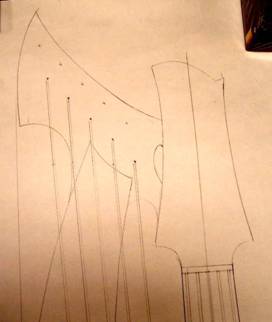 I was in a quagmire. So, it was back to the drawing board… Again, the first design that came to mind was the Larson harp mandolin that Robert Hartman brought to the second Harp Guitar Gathering. I really liked the overall design of the instrument. Especially the bottom cutaway which looked more natural compared to my earlier drawings.
